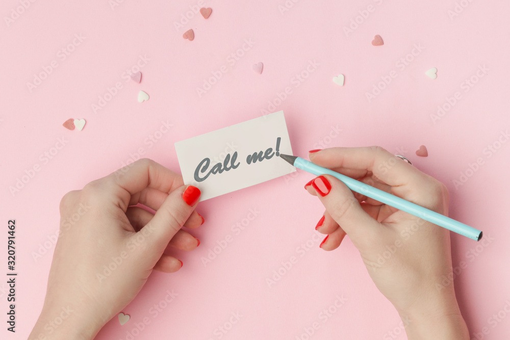 Top view of female writing call me note on a pink background, Valentine's day concept