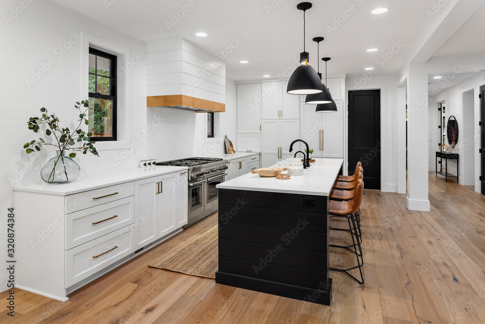 Beautiful white kitchen with dark accents in new modern farmhouse style luxury home