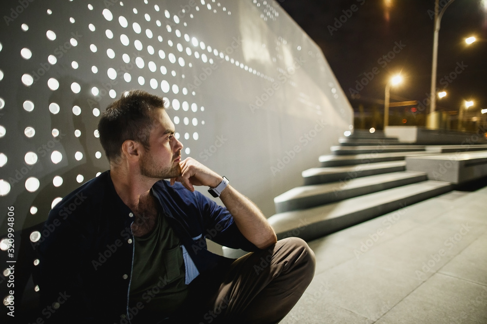 A man sits and thinking on a modern night promenade in the light of lanterns. Travel cityscape