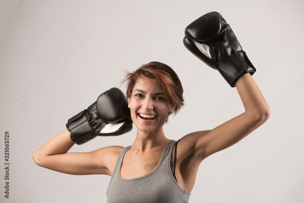 donna boxer felice con i guantoni da boxe isolata su sfondo grigio chiaro