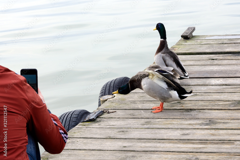 Valencia, Spain. A young man photographs on a cell phone two ducks on a wooden bridge. Lake and Albufera Natural Park (El Parque Natural de la Albufera de Valencia). Amazing bird sanctuary.