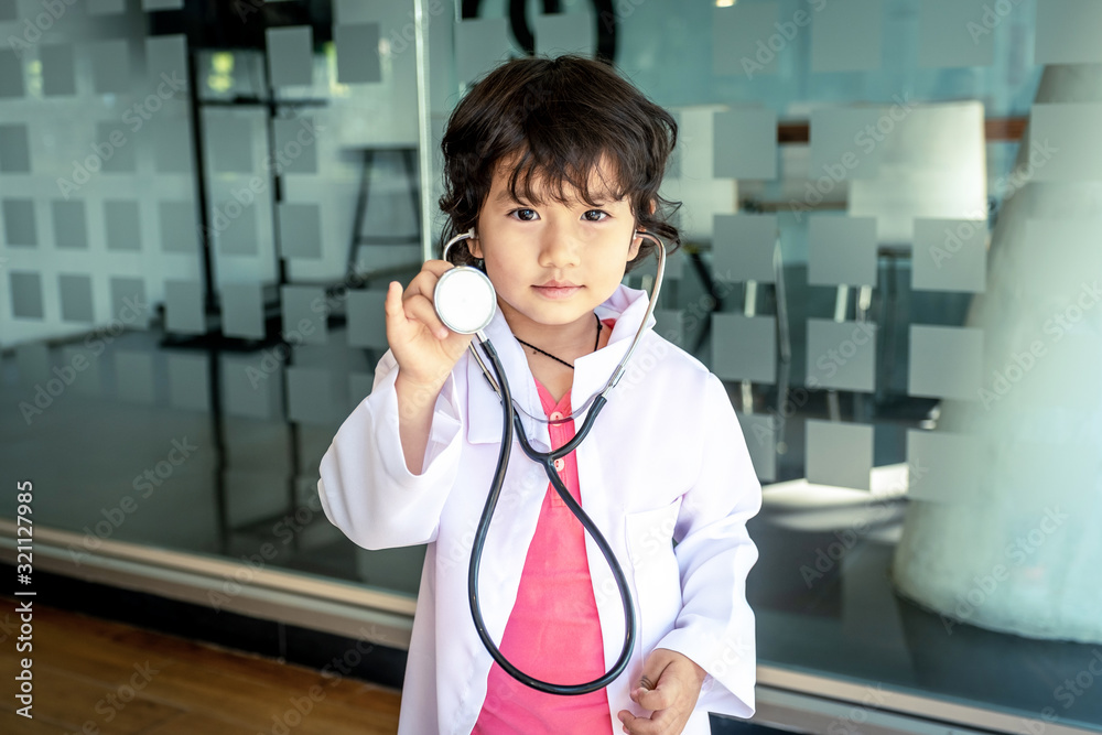 Photo of kid doctor with stethoscope working in the office