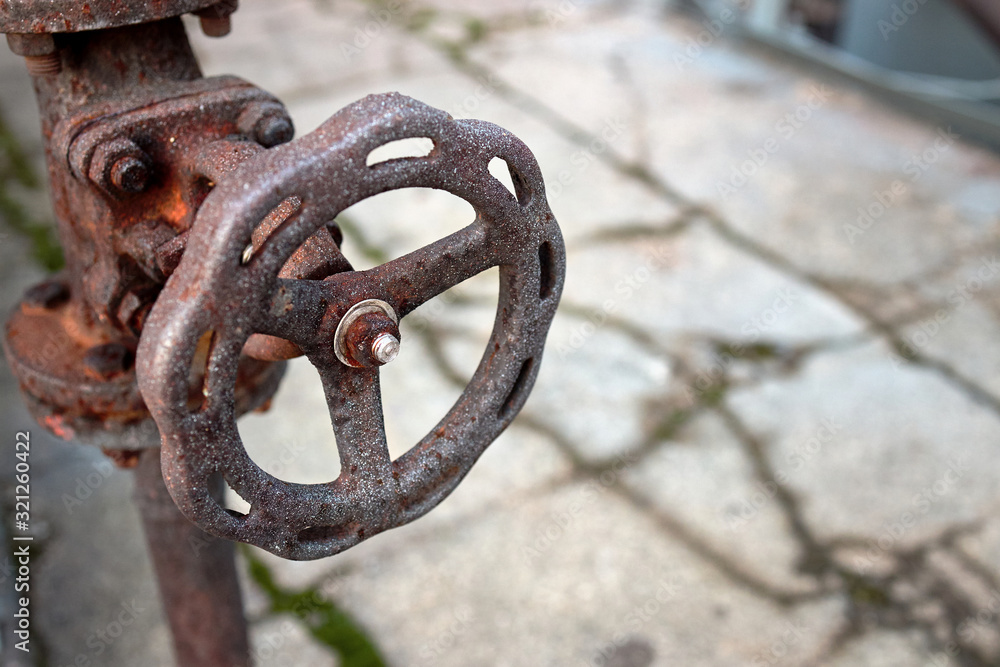 Industrial pipeline and valve close up, blur concrete background. Old rusty control equipment, abandoned plant industry with copyspace