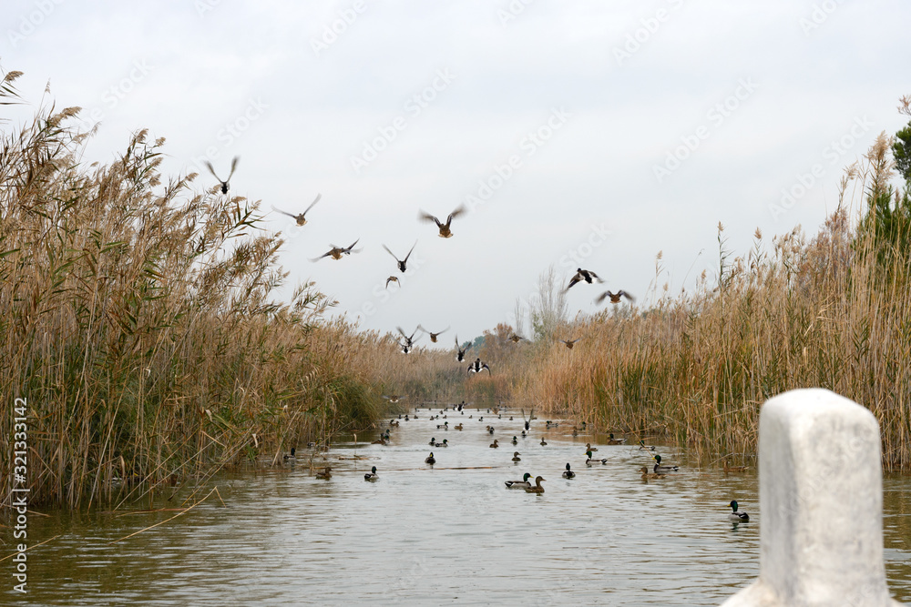 Valencia, Spain. Lake and Albufera Natural Park (El Parque Natural de la Albufera de Valencia) on a cloudy day. Amazing bird sanctuary.