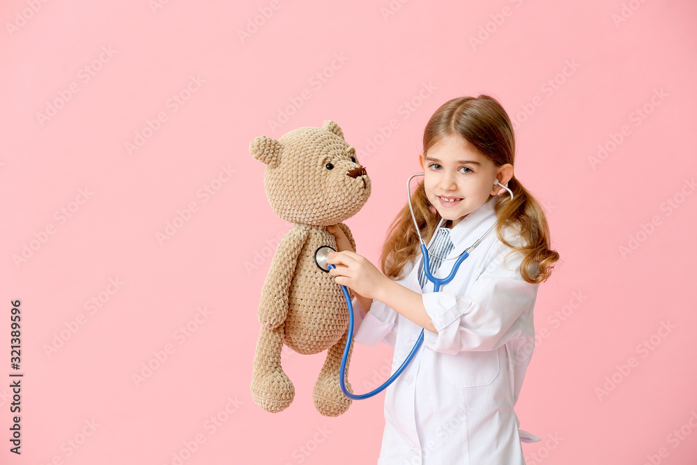 Cute little doctor with toy on color background