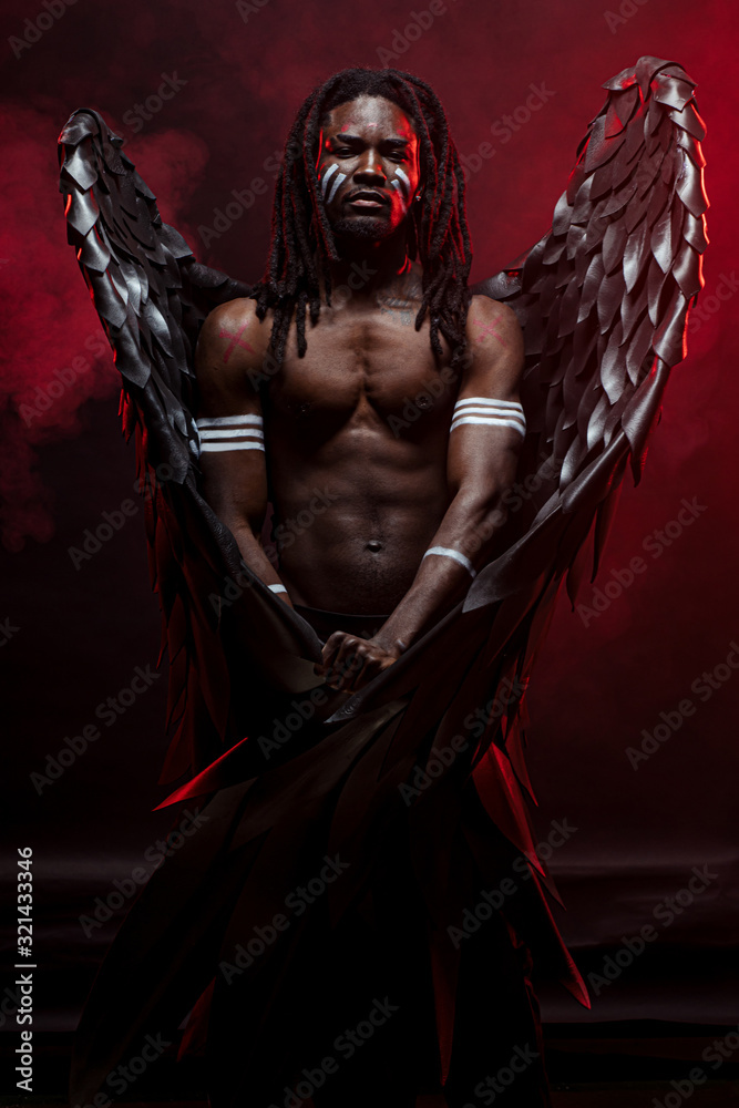 young muscular man in the flesh of angel stand confidently looking at camera, having magnificent black wings on back. isolated over black space with red smoke