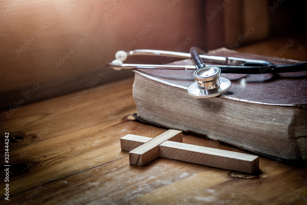 Cross with stethoscope and Bible on wooden table, christian treatment concept.