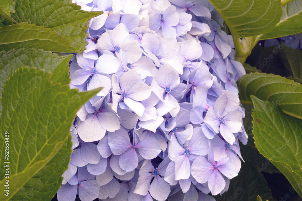 Huge inflorescences of pink large hydrangea (Latin Hydrangea macrophylla). Beautiful, toxic and healing flower hydrangea - a symbol of the island of San Miguel, Azores, Portugal.