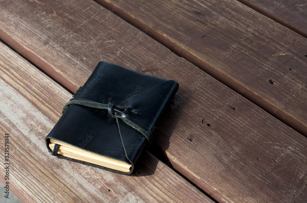 A closed leather bound black journal outdoors on table, wrapped with cord with copy space.