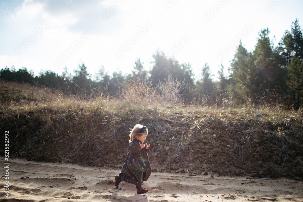 Cute little smiling girl running in autumn forest. Disobedience. happiness. Side view