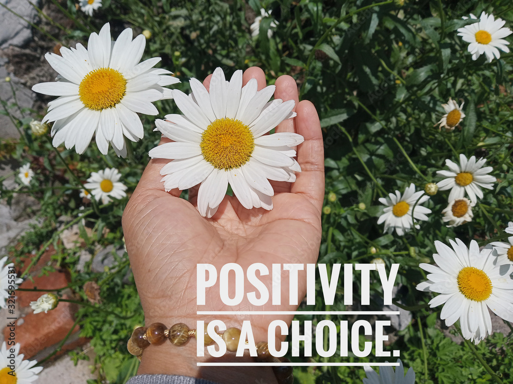 Inspirational quote - Positivity is a choice. With young woman hand holding white daisy flower blossom in hand background. Positive words with nature.