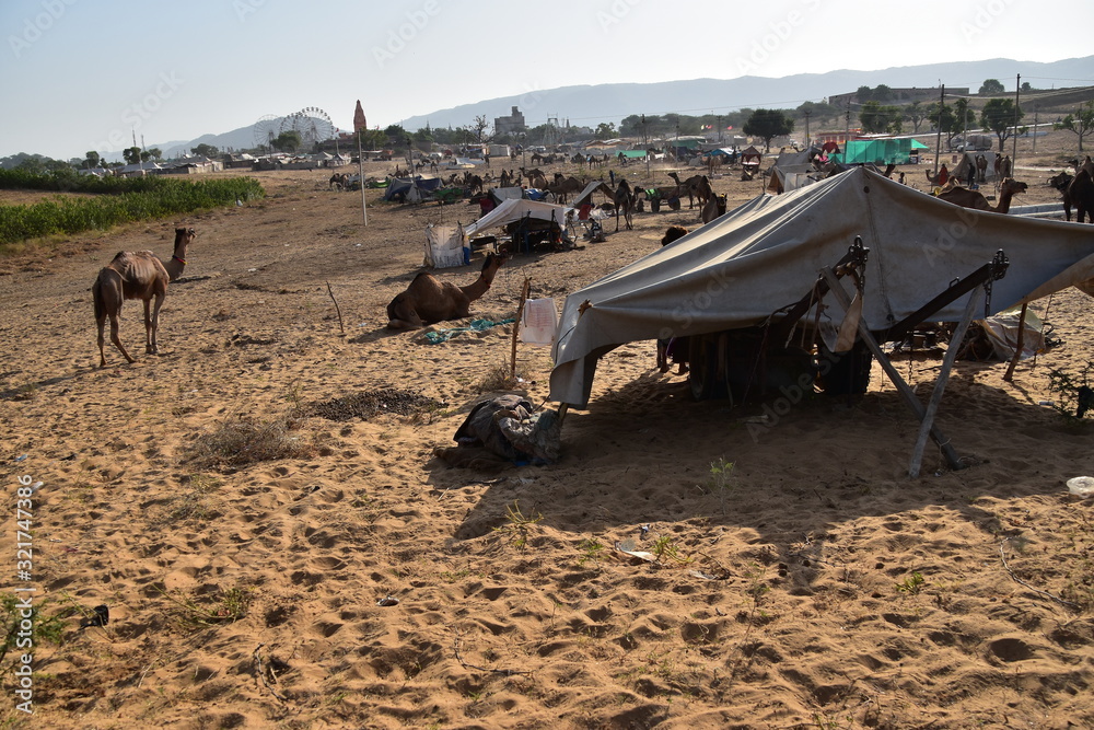 インドのラジャスタン州のプシュカル 一年に一度のラクダ祭期間中 砂漠に集まるラクダの群れ 砂漠で野営するラクダ使いの家族