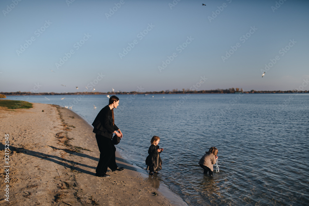kids and mom running in water on river bank in autumn. Boy is drinking river water. Disobedience. Happy family on the river Bank on sunset.