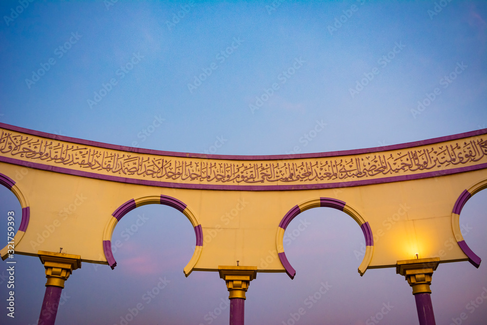 Semarang, Indonesia - CIRCA Nov 2019: The wall with arabic calligraphy and arch decoration in Masjid Agung Jawa Tengah (Great Mosque of Central Java) at sunset.