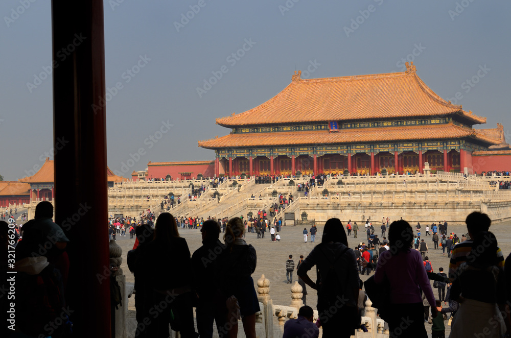 Silhouetted visitors viewing the Hall of Supreme Harmony from the Gate in the Forbidden City Beijing