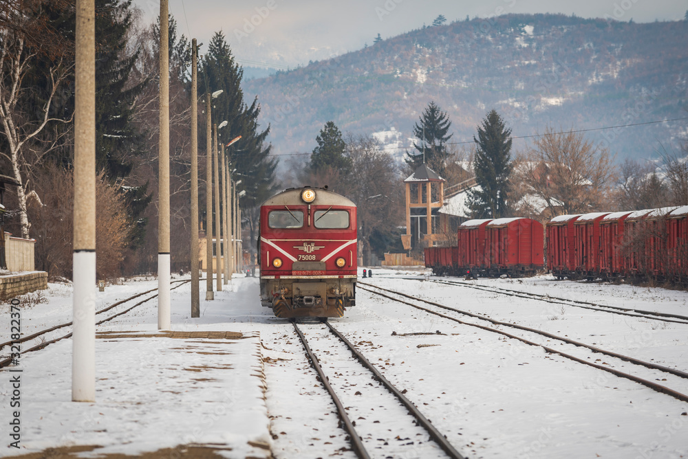 Velingrad railway station, Bulgaria - February 8, 2020: Train with red locomotive and green wagons arrives at the train station.