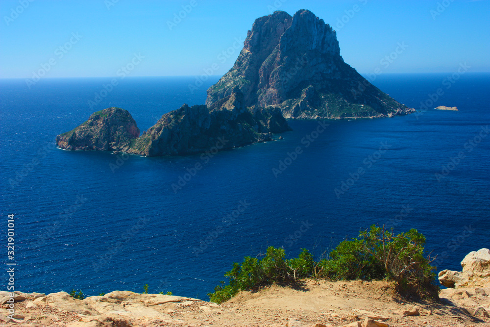 The magical island of Es Vedra with the small islet of Es Vedranell next to it in front of the coast of Cala d'Hort in the tourist island of Ibiza in the midst of nature between cliffs,