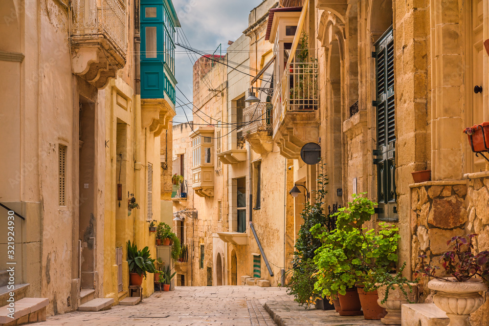 Old medieval street with yellow buildings, beautiful balconies and flower pots in Birgu, Valletta, Malta