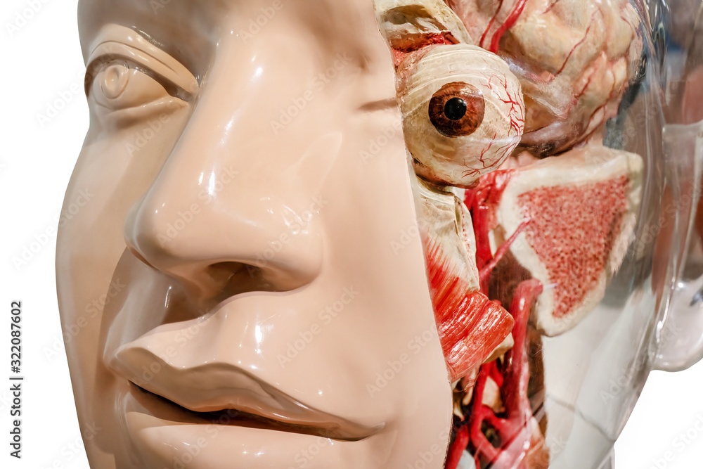 Anatomy female head and face model for doctor and education isolated on white background. Close up of anatomy physiology female head.