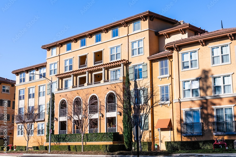 Exterior view of modern apartment building offering luxury rental units in Silicon Valley; San Jose, San Francisco bay area, California