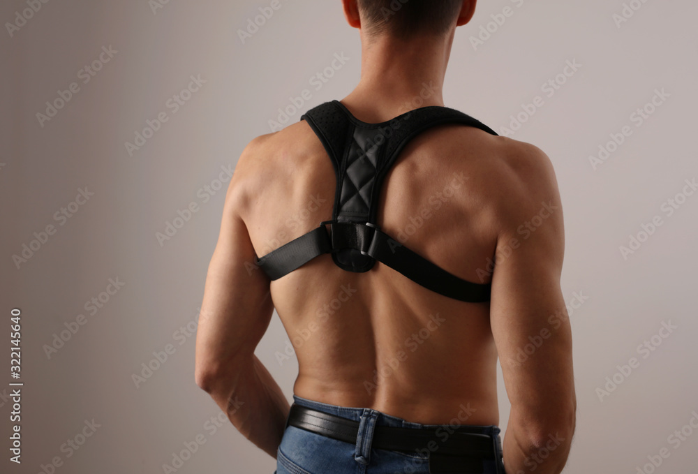 Attractive muscular man with posture corrector. Scoliosis, Kyphosis treatment