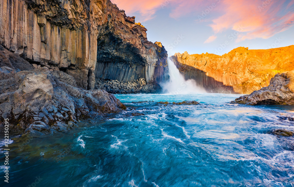 View from flying drone. Great summer sunrise on Ingvararfoss waterfall. Attractive morning scene of Iceland, Europe. Beauty of nature concept background.