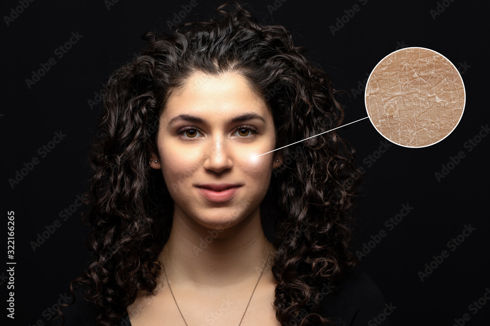 Wrinkles and dry skin on the face of a Caucasian girl, concept of beauty and skin care