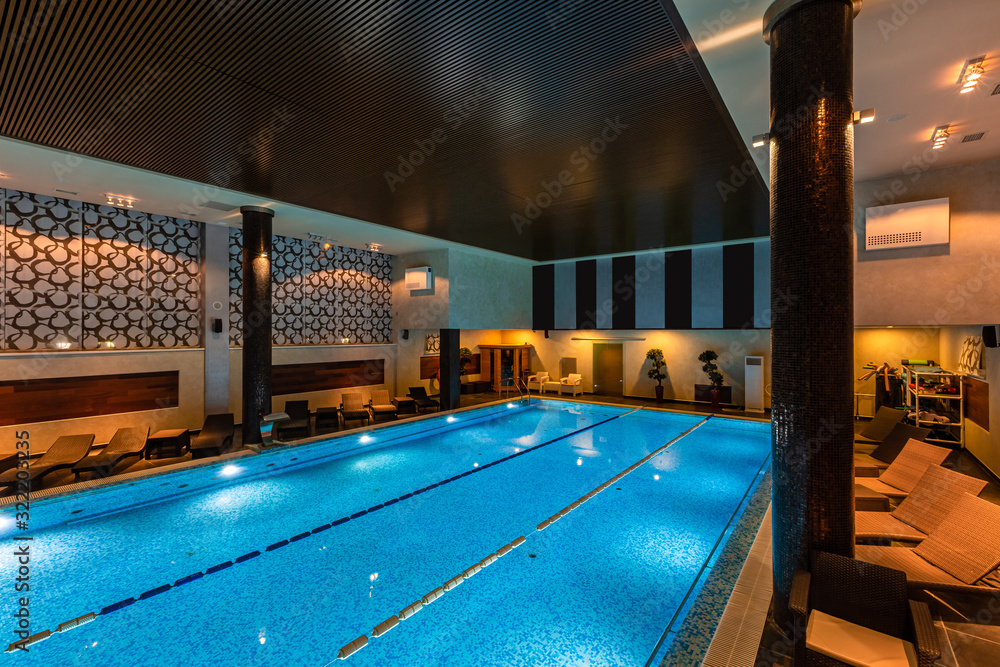 Modern blue on light backdrop. Trendy design. Water - swimming pool. Blue luxurious swimming pool in modern style on light background. Water - swimming pool. Modern design. Night club. Trendy design.