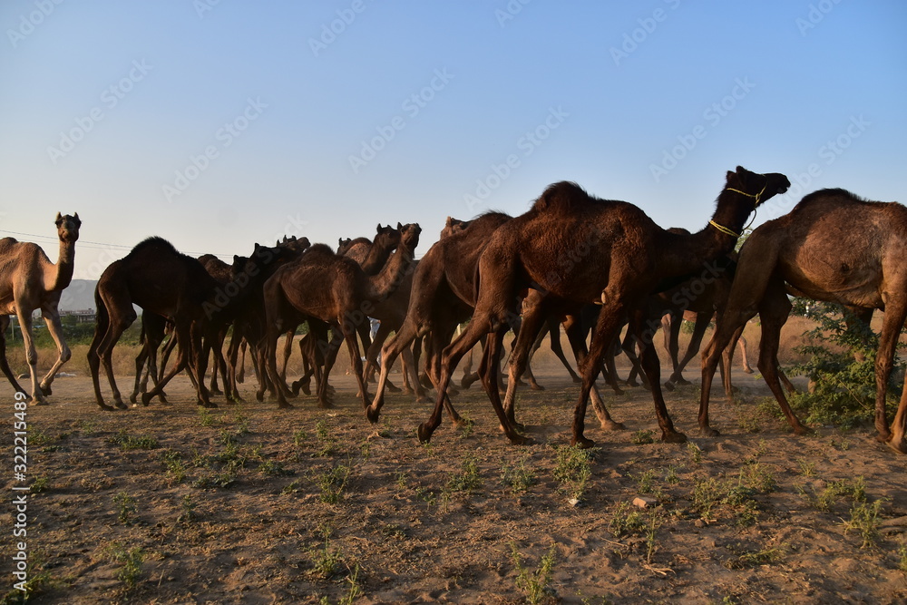 インドのラジャスタン州のプシュカル 一年に一度のラクダ祭期間中 砂漠に集まるラクダの群れ 夕暮れ時に砂漠を移動するラクダの群れ