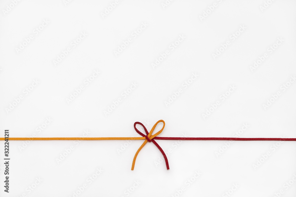 Yellow and red ribbon isolated on white background. two colors chamois string tied in a bow.