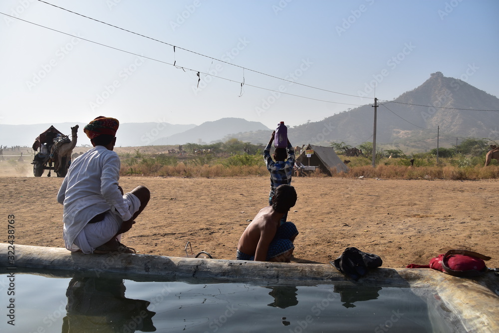 インドのラジャスタン州のプシュカル 一年に一度のラクダ祭期間中 砂漠に集まるラクダの群れ 共同水飲み場で休憩するラクダ使いの男性