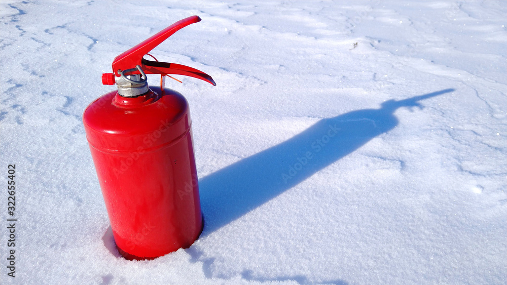 Red fire extinguisher on a winter surface of white shiny snow with a shadow from snow drifts