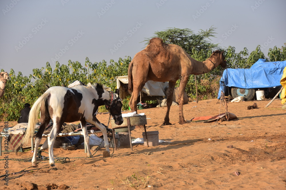 インドのラジャスタン州のプシュカル 一年に一度のプシュカル祭期間中 砂漠で生活する馬とラクダ