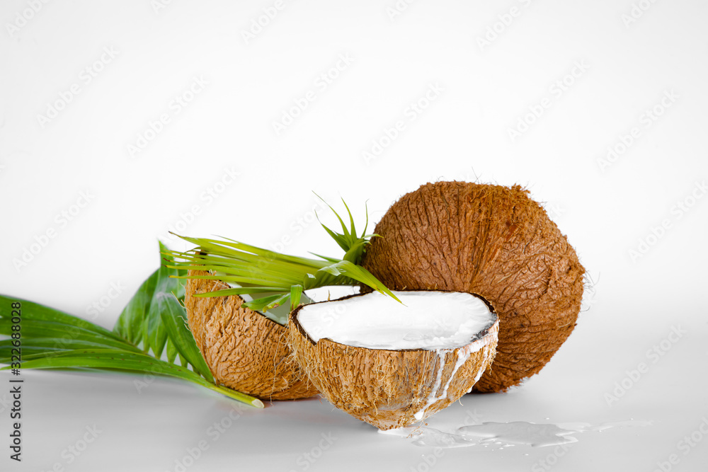Ripe half cut coconut on white background. Real coconut cream and oil.