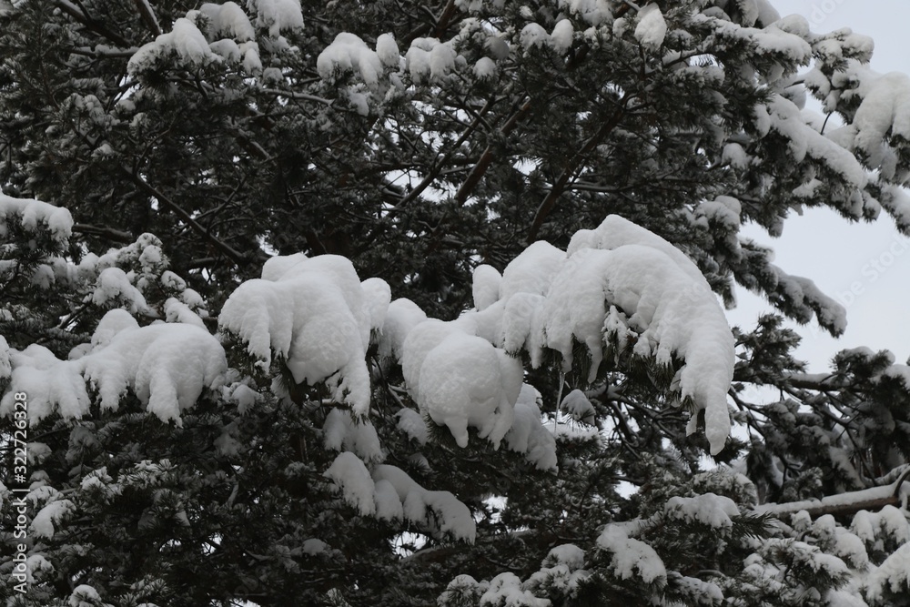 Winter forest pine tree snowflakes falling. Fir branches covered with frost and snow. Blurred winter background with copy space area. Background with snow covered branches.artvin /turkey