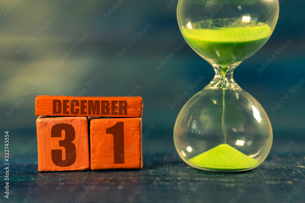 december 31st. Day 31of month,Handmade wood cube with date month and day and hourglass with green sand. Time passing away. artistic coloring. winter month, day of the year concept