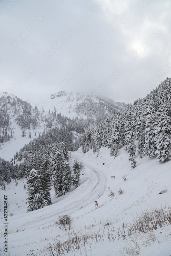 Winter view in a mountain forest covered with fresh snow. Christmas landscape