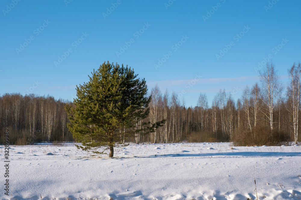 Winter landscape with a lonely pine on the background of a birch forest and blue sky.