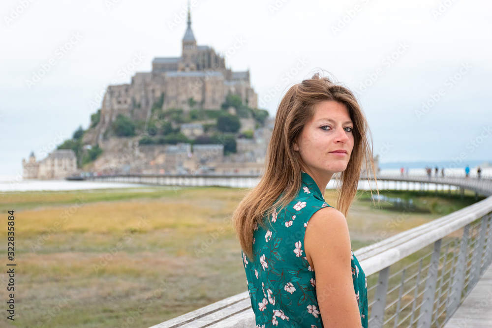 Portrait belle et charmante jeune femme combinaison caucasian brune aux yeux bleu joyeuse et confiance en soi séduisante chanceuse charismatique française européenne heureuse zen à mont saint michel