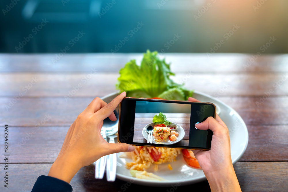 Hand holding mobile phone and take a photo Fried rice with spicy shrimp on blurred wooden table background with sunlight.