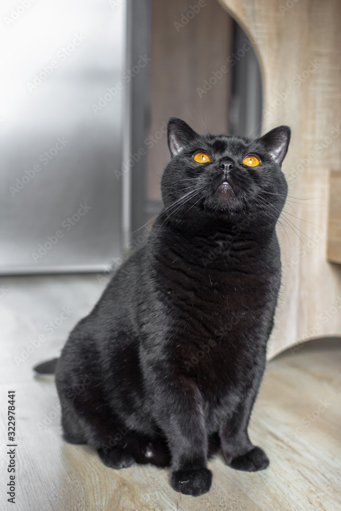 Black cat. The breed is Scottish straight. Cat pupils. Amber eyes. Animal protection. Symbol of misfortune. Friday the 13th. Bad omen. Thoroughbred pet. Friend of human. Shiny black coat.