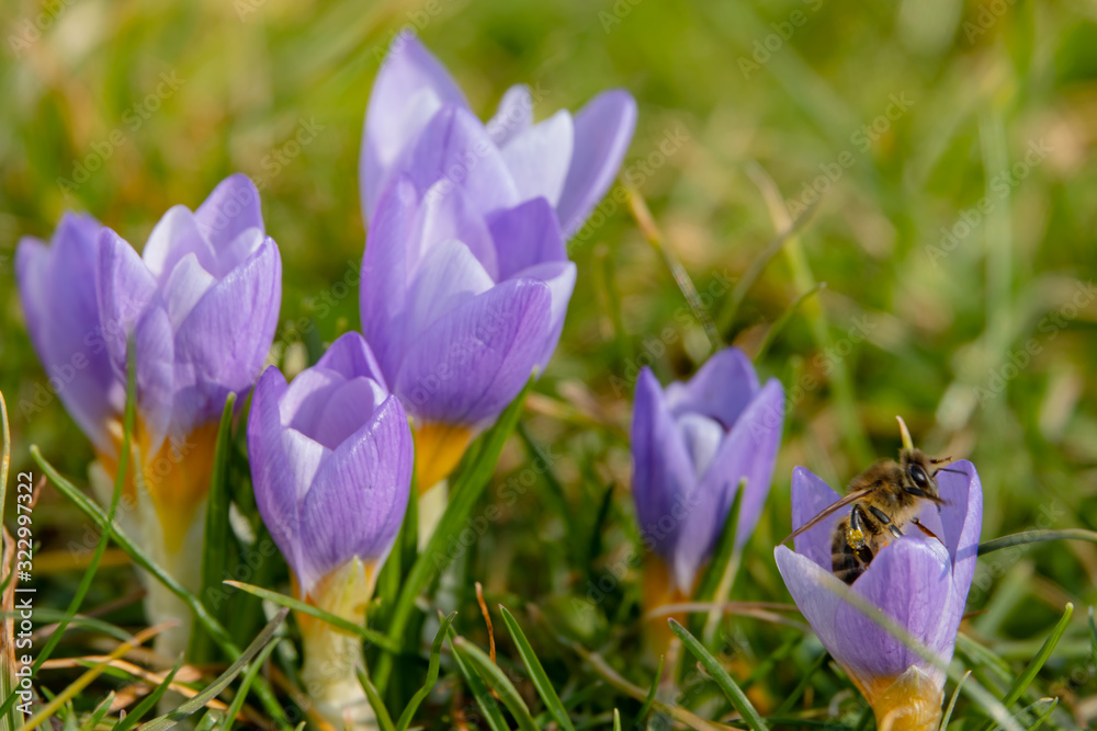 Erste Biene auf Krokus Vorbote des Frühlings