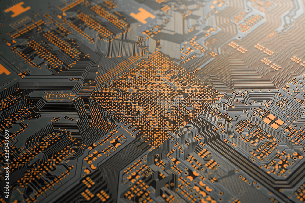 A close-up of black blank Printed circuit board (PCB) with no component mounted (copper exposed)