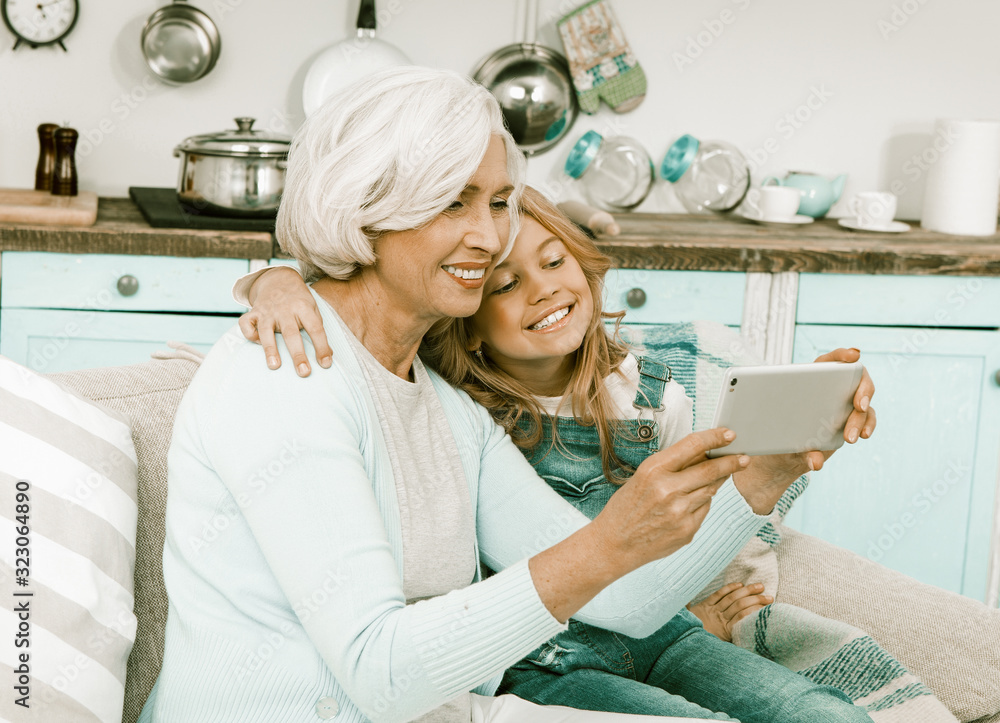 Grandmother and granddaughter happily making selfie or family photos