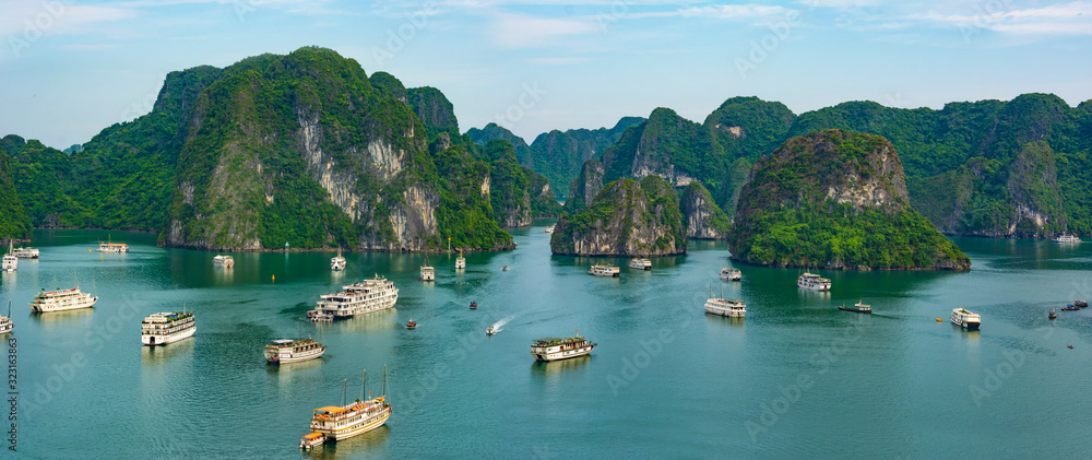Aerial view of Ha Long Bay; with a lot of limestone islets and cruise ships; on a cloudy summer day.
