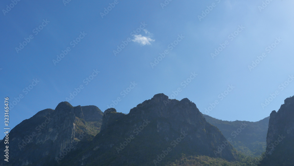 Limestone mountain in the morning light that shines from behind with blue sky and small white cloud in background , Khao Sam Roi Yot national park ,Thailand