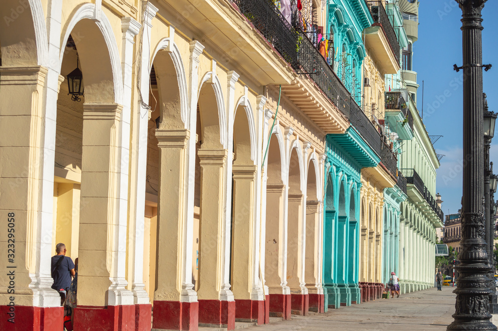 HAVANA,CUBA - MAY 4,2019 : Street scene with classic old cars and traditional colorful buildings in downtown Havana floridita capitolio plaza de la constitucion