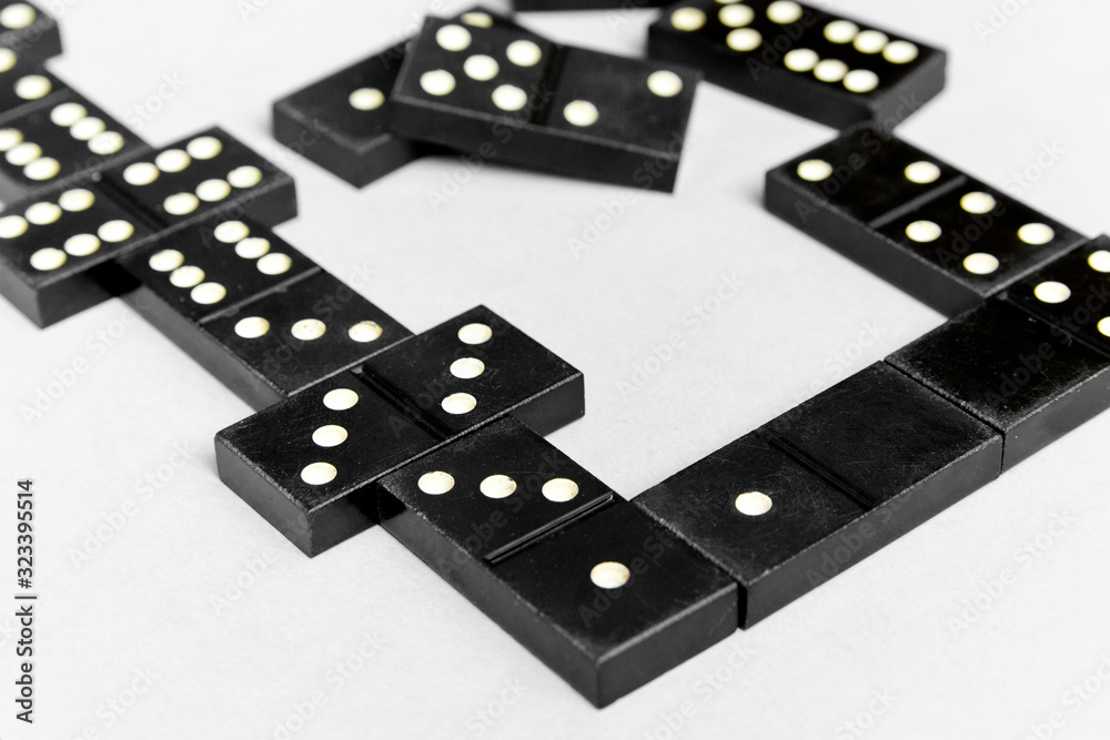 Black old, vintage dominoes on a cardboard background. The concept of the game dominoes. Selective focus