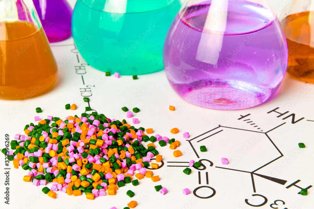 Plastic raw material in granules against the background of Chemical Laboratory and reagents. Polypropylene, Ethylene, Polypropylene research in laboratory conditions