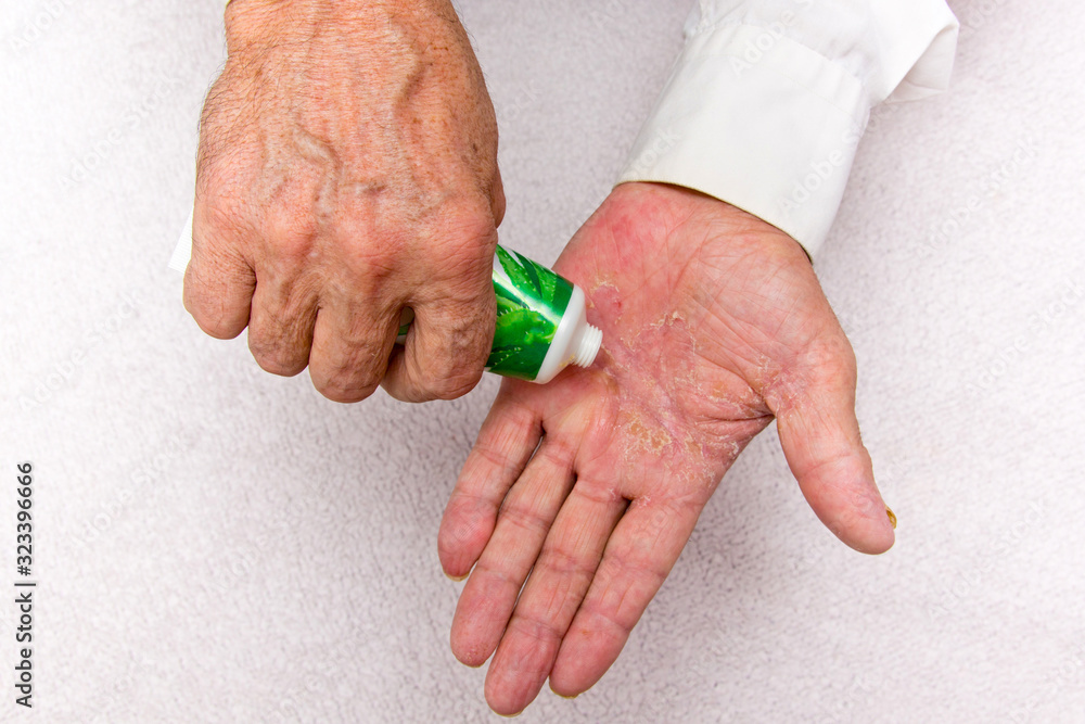 Ointment on the hands of an elderly person. Applying the ointment and emollient cream in the treatment and hydration of the skin . Problem skin in old age